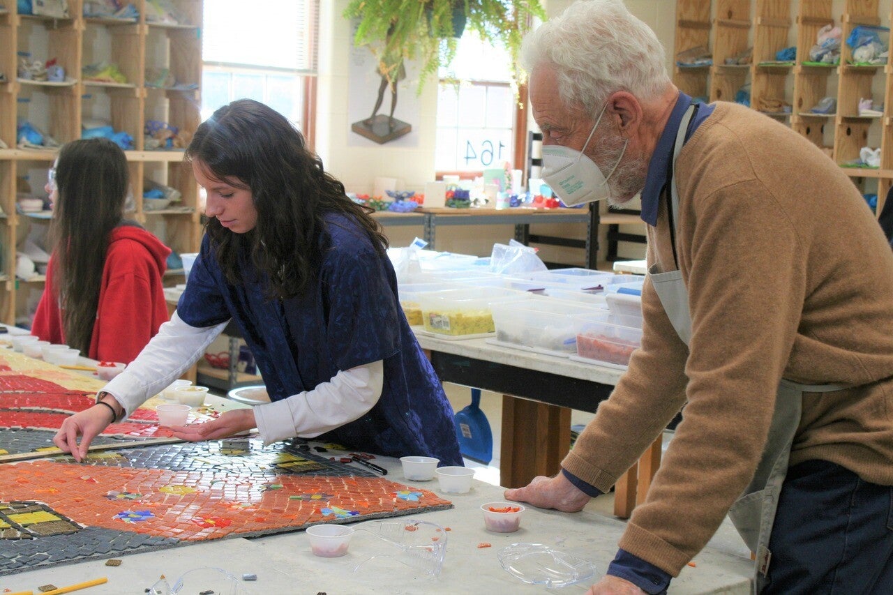 Julie Petersen, an Avon High School senior, places glass tiles in a mosaic panel that will honor late teacher Caitlin Kacher, with guest artist George Woideck looking on. The project, delayed by the COVID-19 shutdown, is expected to be unveiled in the spring. (John Matuszak, special to cleveland.com)